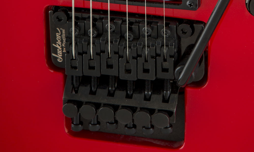 El sistema de trémolo Floyd Rose de la marca Jackson te permite bloquear la afinación de tu guitarra en la cejuela y en el puente, lo que da como resultado una mayor estabilidad de afinación y sustain.