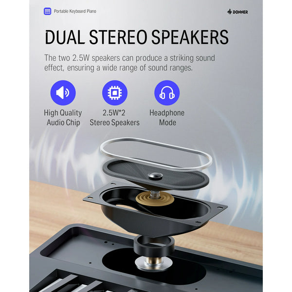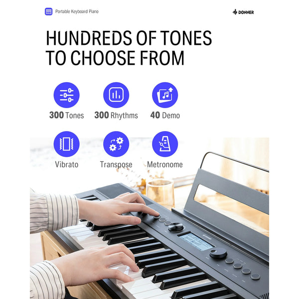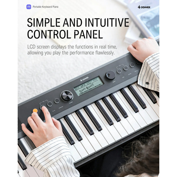 El teclado SD-10 de Donner destaca por su diseño portátil, la versatilidad de sus funciones y la posibilidad de usarlo en diferentes espacios y situaciones.