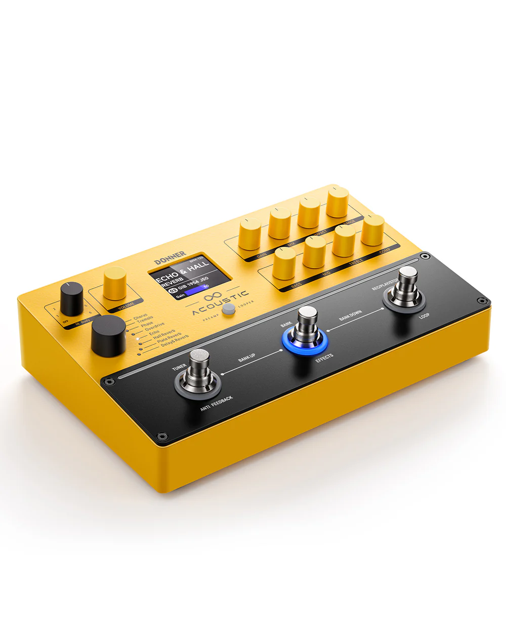 El Donner Acoustic EC6928 es un pedal multi-efectos diseñado especificamente para guitarras acústicas.