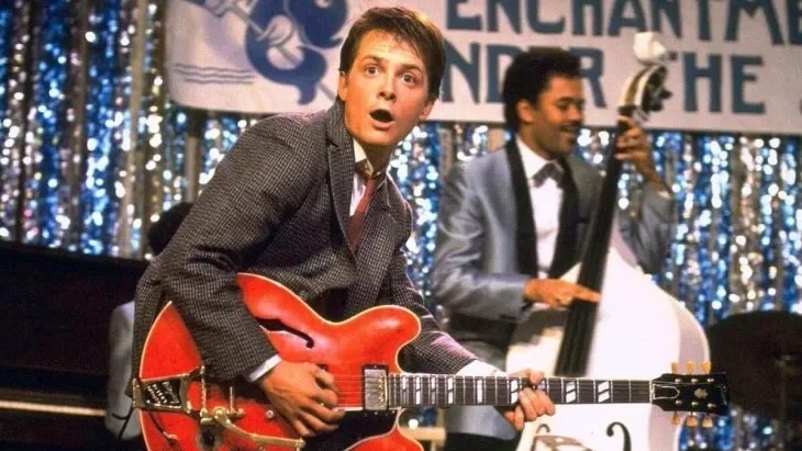 Si debemos hablar de guitarras icónicas en el cine, la Gibson ES-345 Cherry Red que Marty McFly usó para interpretar a «Johnny B. Goode» en la película «Volver al Futuro» es sin duda la más recordada.