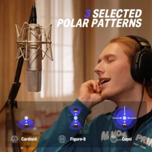 Con tres patrones polares seleccionables, filtro de corte bajo y pad de -10 dB, se adapta a diversas situaciones de grabación, desde voces solistas hasta instrumentos de alto volumen, garantizando versatilidad y precisión.
